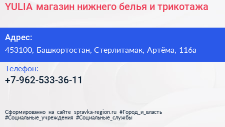 YULIA, магазин нижнего белья и трикотажа по адресу 453100, Башкортостан, Стерлитамак, Артёма, 116а в дальнейшем Организация, размещена в следующих категориях:
