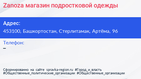 Zanoza, магазин подростковой одежды по адресу 453100, Башкортостан, Стерлитамак, Артёма, 96 в дальнейшем Организация, размещена в следующих категориях: