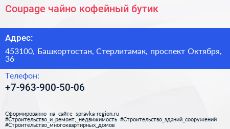 Coupage, чайно-кофейный бутик по адресу 453100, Башкортостан, Стерлитамак, проспект Октября, 36 в дальнейшем Организация, размещена в следующих категориях: