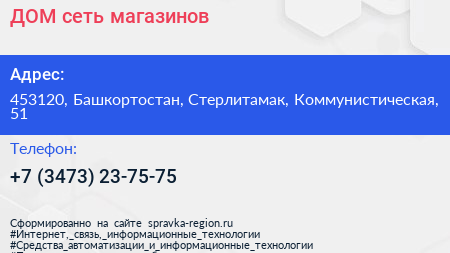 ДОМ, сеть магазинов по адресу 453120, Башкортостан, Стерлитамак, Коммунистическая, 51 в дальнейшем Организация, размещена в следующих категориях: