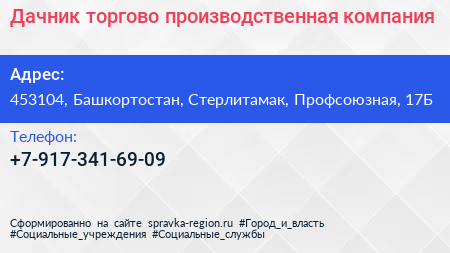 Дачник, торгово-производственная компания по адресу 453104, Башкортостан, Стерлитамак, Профсоюзная, 17Б в дальнейшем Организация, размещена в следующих категориях: