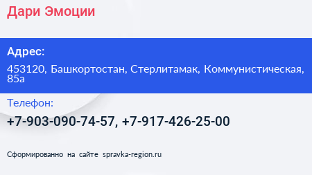 Дари Эмоции по адресу 453120, Башкортостан, Стерлитамак, Коммунистическая, 85а в дальнейшем Организация, размещена в следующих категориях: