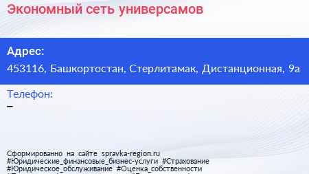 Экономный, сеть универсамов по адресу 453116, Башкортостан, Стерлитамак, Дистанционная, 9а в дальнейшем Организация, размещена в следующих категориях: