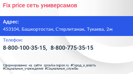 Fix price, сеть универсамов по адресу 453104, Башкортостан, Стерлитамак, Тукаева, 2ж в дальнейшем Организация, размещена в следующих категориях: