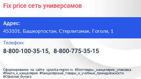 Fix price, сеть универсамов по адресу 453101, Башкортостан, Стерлитамак, Гоголя, 1 в дальнейшем Организация, размещена в следующих категориях: