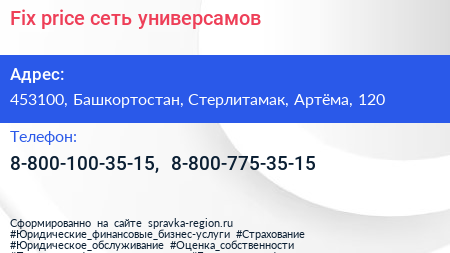 Fix price, сеть универсамов по адресу 453100, Башкортостан, Стерлитамак, Артёма, 120 в дальнейшем Организация, размещена в следующих категориях: