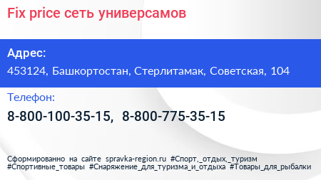 Fix price, сеть универсамов по адресу 453124, Башкортостан, Стерлитамак, Советская, 104 в дальнейшем Организация, размещена в следующих категориях: