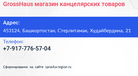 GrossHaus, магазин канцелярских товаров по адресу 453124, Башкортостан, Стерлитамак, Худайбердина, 21 в дальнейшем Организация, размещена в следующих категориях: