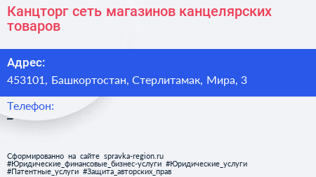 Канцторг, сеть магазинов канцелярских товаров по адресу 453101, Башкортостан, Стерлитамак, Мира, 3 в дальнейшем Организация, размещена в следующих категориях: