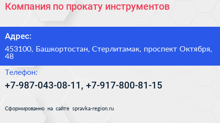 Компания по прокату инструментов по адресу 453100, Башкортостан, Стерлитамак, проспект Октября, 48 в дальнейшем Организация, размещена в следующих категориях: