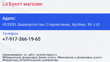La & Букет, магазин по адресу 453100, Башкортостан, Стерлитамак, Артёма, 96 ст2 в дальнейшем Организация, размещена в следующих категориях: