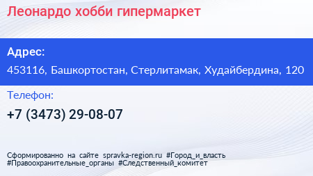 Леонардо, хобби-гипермаркет по адресу 453116, Башкортостан, Стерлитамак, Худайбердина, 120 в дальнейшем Организация, размещена в следующих категориях: