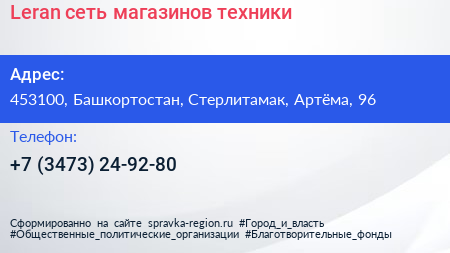 Leran, сеть магазинов техники по адресу 453100, Башкортостан, Стерлитамак, Артёма, 96 в дальнейшем Организация, размещена в следующих категориях: