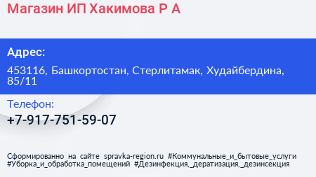 Магазин, ИП Хакимова Р.А. по адресу 453116, Башкортостан, Стерлитамак, Худайбердина, 85/11 в дальнейшем Организация, размещена в следующих категориях:
