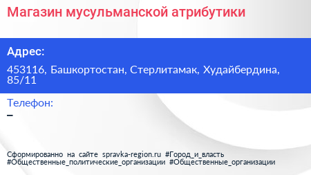 Магазин мусульманской атрибутики по адресу 453116, Башкортостан, Стерлитамак, Худайбердина, 85/11 в дальнейшем Организация, размещена в следующих категориях: