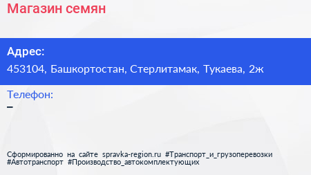 Магазин семян по адресу 453104, Башкортостан, Стерлитамак, Тукаева, 2ж в дальнейшем Организация, размещена в следующих категориях: