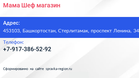 Мама Шеф, магазин по адресу 453103, Башкортостан, Стерлитамак, проспект Ленина, 34 в дальнейшем Организация, размещена в следующих категориях:
