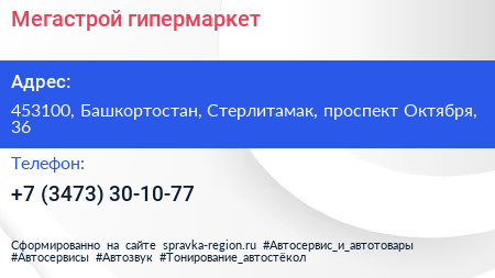 Мегастрой, гипермаркет по адресу 453100, Башкортостан, Стерлитамак, проспект Октября, 36 в дальнейшем Организация, размещена в следующих категориях: