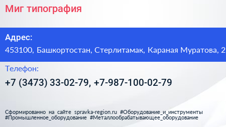 Миг, типография по адресу 453100, Башкортостан, Стерлитамак, Караная Муратова, 2 в дальнейшем Организация, размещена в следующих категориях: