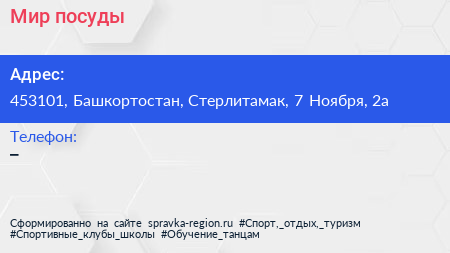 Мир посуды по адресу 453101, Башкортостан, Стерлитамак, 7 Ноября, 2а в дальнейшем Организация, размещена в следующих категориях: