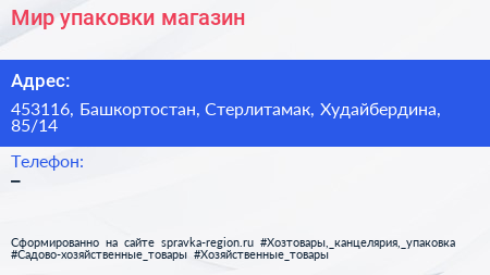 Мир упаковки, магазин по адресу 453116, Башкортостан, Стерлитамак, Худайбердина, 85/14 в дальнейшем Организация, размещена в следующих категориях: