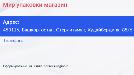 Мир упаковки, магазин по адресу 453116, Башкортостан, Стерлитамак, Худайбердина, 85/6 в дальнейшем Организация, размещена в следующих категориях: