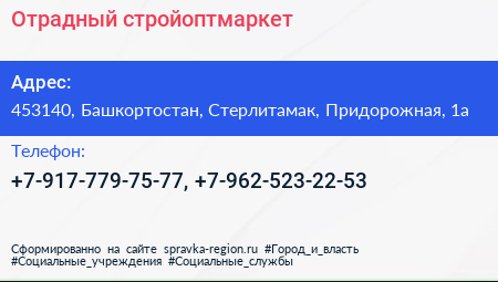 Отрадный, стройоптмаркет по адресу 453140, Башкортостан, Стерлитамак, Придорожная, 1а в дальнейшем Организация, размещена в следующих категориях: