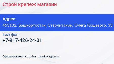 Строй крепеж, магазин по адресу 453102, Башкортостан, Стерлитамак, Олега Кошевого, 33 в дальнейшем Организация, размещена в следующих категориях:
