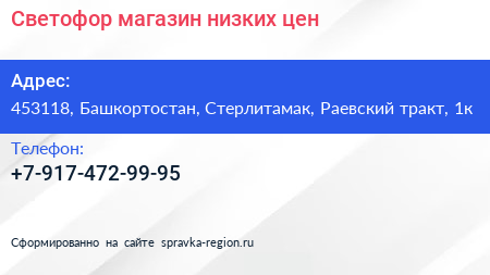 Светофор, магазин низких цен по адресу 453118, Башкортостан, Стерлитамак, Раевский тракт, 1к в дальнейшем Организация, размещена в следующих категориях: