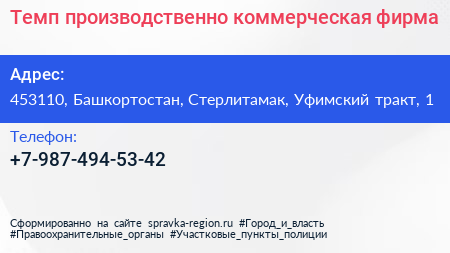 Темп, производственно-коммерческая фирма по адресу 453110, Башкортостан, Стерлитамак, Уфимский тракт, 1 в дальнейшем Организация, размещена в следующих категориях: