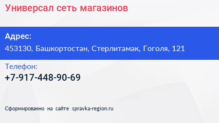 Универсал, сеть магазинов по адресу 453130, Башкортостан, Стерлитамак, Гоголя, 121 в дальнейшем Организация, размещена в следующих категориях: