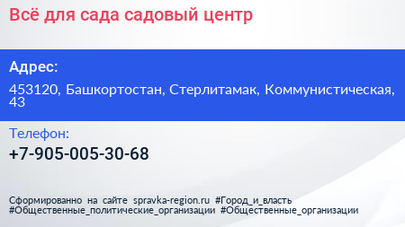 Всё для сада, садовый центр по адресу 453120, Башкортостан, Стерлитамак, Коммунистическая, 43 в дальнейшем Организация, размещена в следующих категориях: