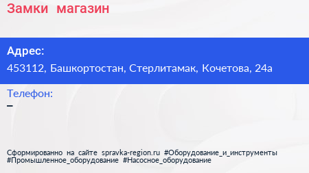 Замки+, магазин по адресу 453112, Башкортостан, Стерлитамак, Кочетова, 24а в дальнейшем Организация, размещена в следующих категориях: