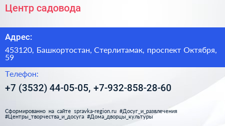 Центр садовода по адресу 453120, Башкортостан, Стерлитамак, проспект Октября, 59 в дальнейшем Организация, размещена в следующих категориях: