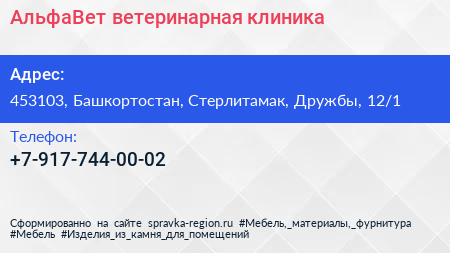 АльфаВет, ветеринарная клиника по адресу 453103, Башкортостан, Стерлитамак, Дружбы, 12/1 в дальнейшем Организация, размещена в следующих категориях: