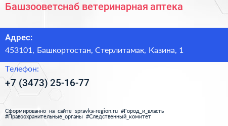 Башзооветснаб, ветеринарная аптека по адресу 453101, Башкортостан, Стерлитамак, Казина, 1 в дальнейшем Организация, размещена в следующих категориях: