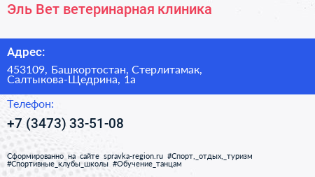 Эль-Вет, ветеринарная клиника по адресу 453109, Башкортостан, Стерлитамак, Салтыкова-Щедрина, 1а в дальнейшем Организация, размещена в следующих категориях: