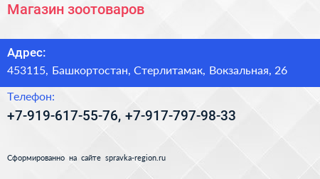 Магазин зоотоваров по адресу 453115, Башкортостан, Стерлитамак, Вокзальная, 26 в дальнейшем Организация, размещена в следующих категориях: