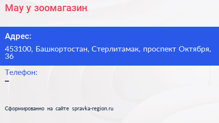 May-y, зоомагазин по адресу 453100, Башкортостан, Стерлитамак, проспект Октября, 36 в дальнейшем Организация, размещена в следующих категориях: