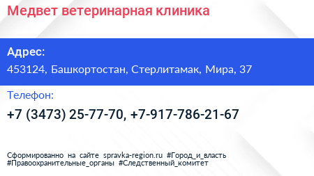 Медвет, ветеринарная клиника по адресу 453124, Башкортостан, Стерлитамак, Мира, 37 в дальнейшем Организация, размещена в следующих категориях: