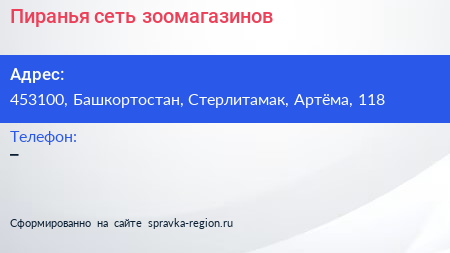 Пиранья, сеть зоомагазинов по адресу 453100, Башкортостан, Стерлитамак, Артёма, 118 в дальнейшем Организация, размещена в следующих категориях: