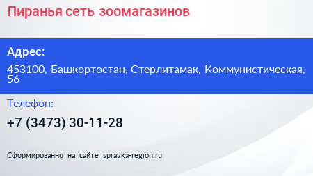 Пиранья, сеть зоомагазинов по адресу 453100, Башкортостан, Стерлитамак, Коммунистическая, 56 в дальнейшем Организация, размещена в следующих категориях: