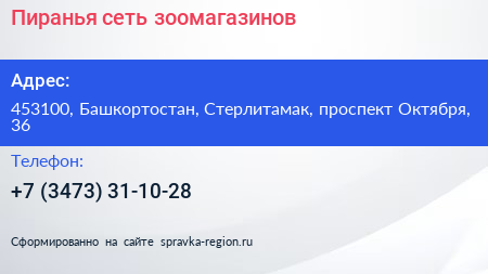 Пиранья, сеть зоомагазинов по адресу 453100, Башкортостан, Стерлитамак, проспект Октября, 36 в дальнейшем Организация, размещена в следующих категориях: