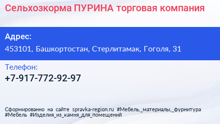 Сельхозкорма ПУРИНА, торговая компания по адресу 453101, Башкортостан, Стерлитамак, Гоголя, 31 в дальнейшем Организация, размещена в следующих категориях: