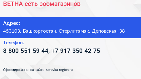 ВЕТНА, сеть зоомагазинов по адресу 453103, Башкортостан, Стерлитамак, Деповская, 38 в дальнейшем Организация, размещена в следующих категориях: