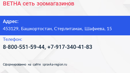 ВЕТНА, сеть зоомагазинов по адресу 453129, Башкортостан, Стерлитамак, Шафиева, 15 в дальнейшем Организация, размещена в следующих категориях: