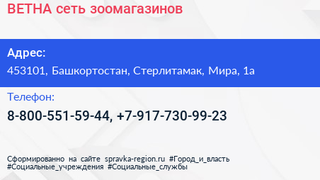 ВЕТНА, сеть зоомагазинов по адресу 453101, Башкортостан, Стерлитамак, Мира, 1а в дальнейшем Организация, размещена в следующих категориях: