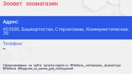 Зоовет+, зоомагазин по адресу 453100, Башкортостан, Стерлитамак, Коммунистическая, 70 в дальнейшем Организация, размещена в следующих категориях: