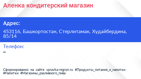 Аленка, кондитерский магазин по адресу 453116, Башкортостан, Стерлитамак, Худайбердина, 85/14 в дальнейшем Организация, размещена в следующих категориях: