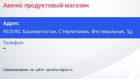 Авеню, продуктовый магазин по адресу 453140, Башкортостан, Стерлитамак, Фестивальная, 1д в дальнейшем Организация, размещена в следующих категориях: